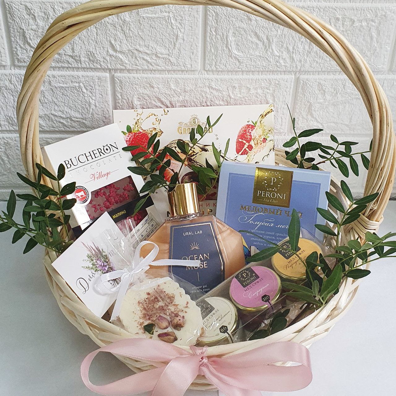 Состав: конфеты марципановые с кусочками клубники и шампанским 98г, шоколад молочный с малиной 100г, чай медовый с цветами синей орхидеи, лавандой, мелиссой, ягодами, 35гр, набор меда-суфле 3 шт 90г (парадайз с абрикосом/мохито с мелиссой/космополитен с клюквой или парадайз с абрикосом/молочный цветок/смородина), гель для душа 230 мл (водяная лилия и морская соль), саше ароматическое с декором, корзина с оформлением.