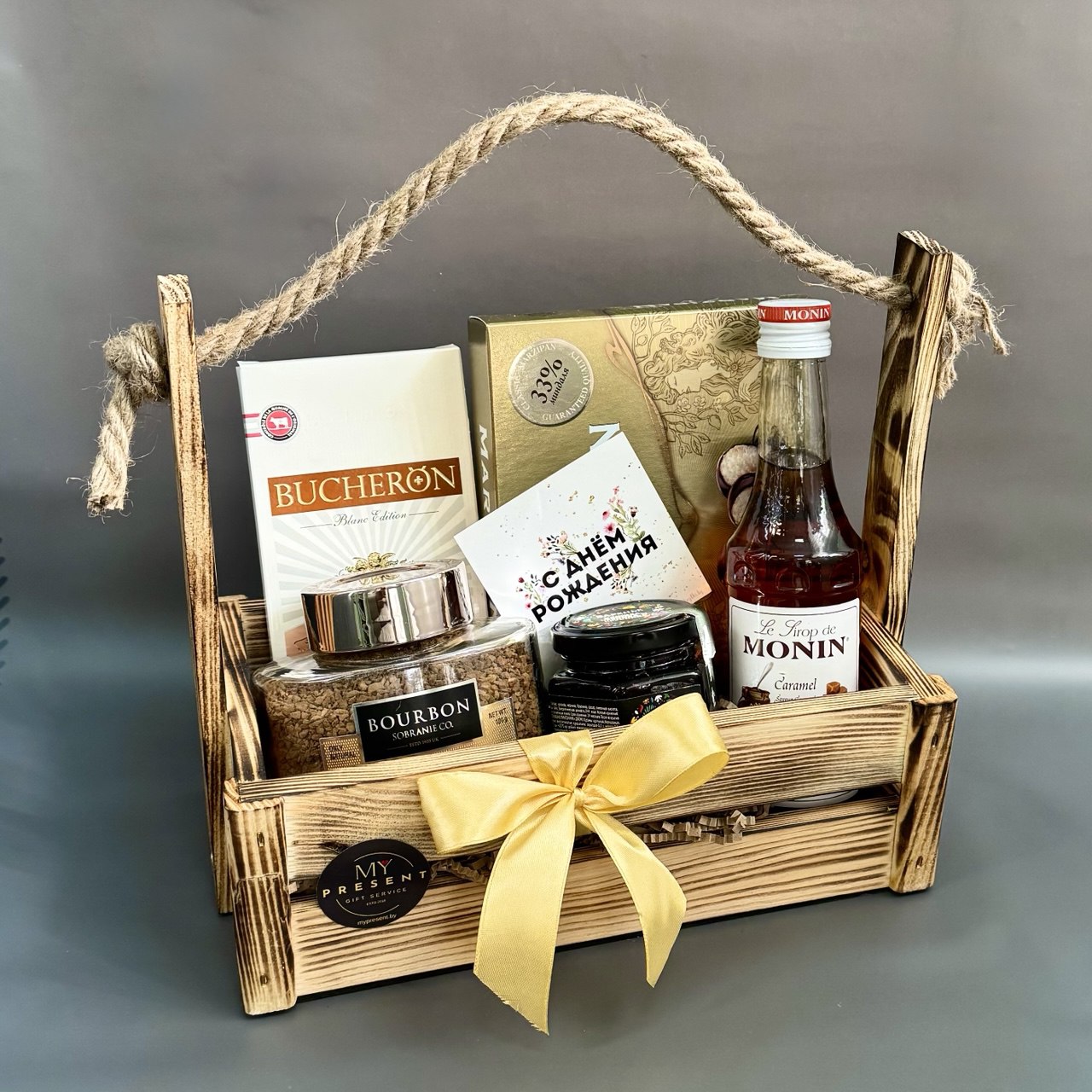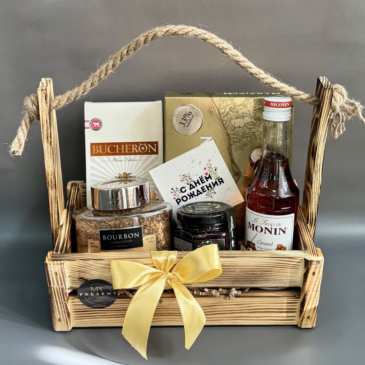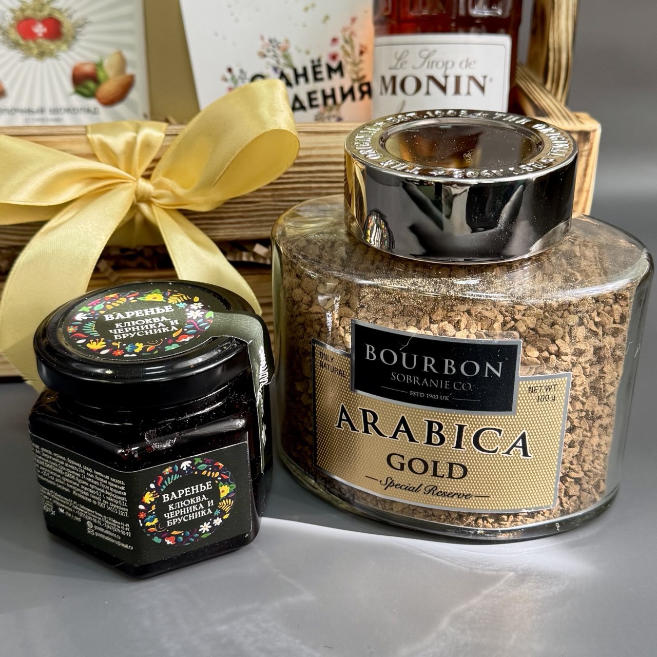 Состав: кофе  сублимированный молотый в растворимом Bourbon Arabica Gold 100г, шоколад 100г, сироп для кофе ваниль (или карамель) Франция 250мл, конфеты марципановые классический марципан (возможен, вариант клюква с водкой для мужчин, клубника шампанское для женщин), варенье брусника/малина/черника 120г (есть другие вкусы), деревянный ящик 26*14*25 с оформлением.