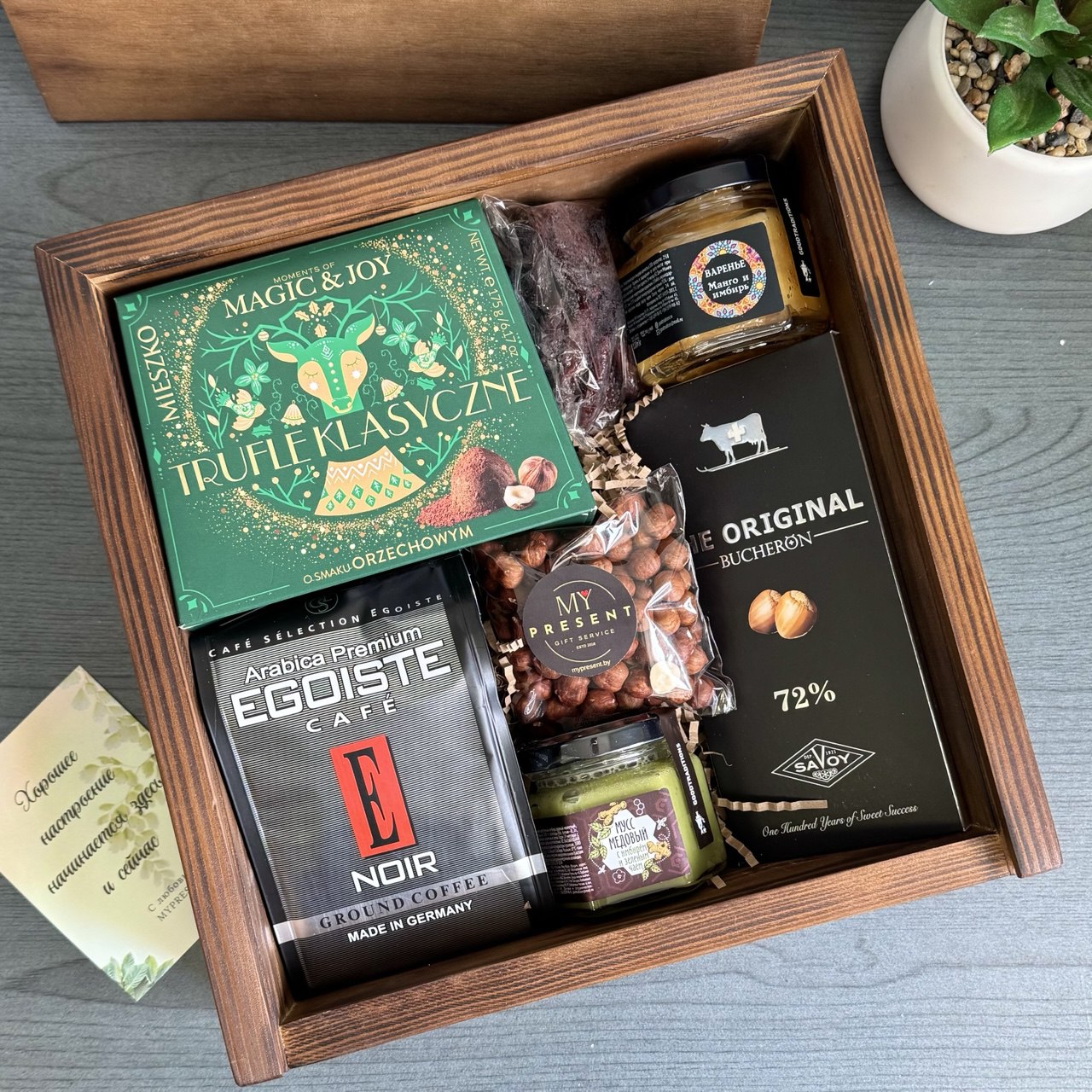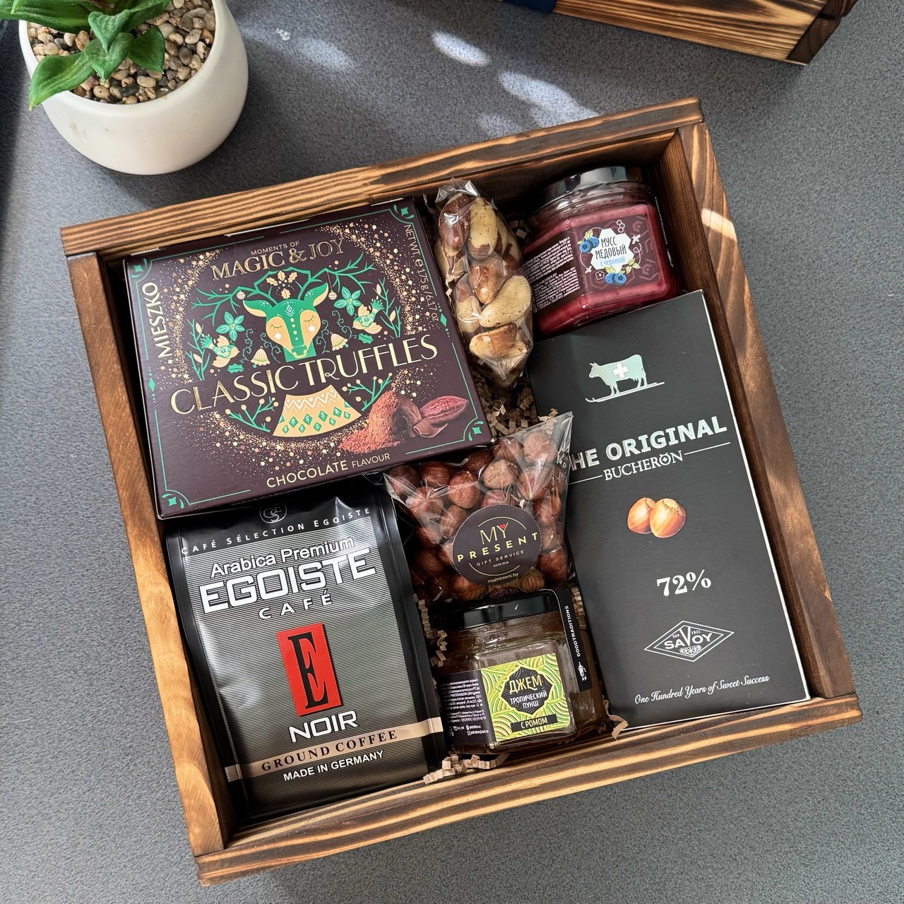Состав: кофе молотый Espresso Egoiste 100г Германия; конфеты трюфель шоколадный или с фундуком Польша; джем цитрусовый вайб с виски (варианты: тропический пунш с ромом, винный блюз, малиновое искушение с абсентом), медовый мусс с имбирём (или черникой, или облепихой), шоколад, бразильский орех, фундук, ящик деревянный с оформлением 23×23×10.