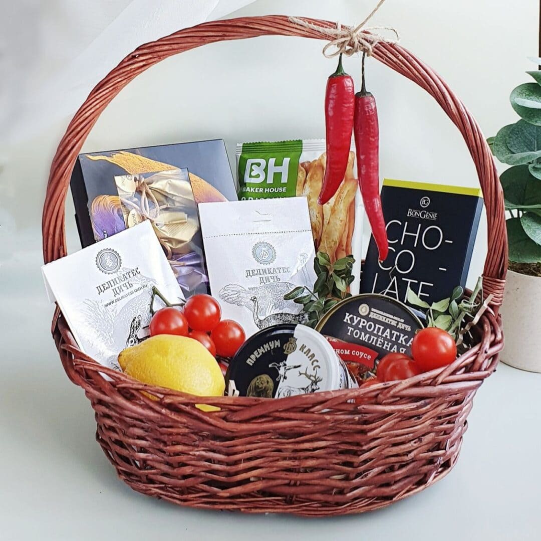 Состав: куропатка томлёная винном соусе; риет из мяса косули с мягким сыром (или другой вид); сушёное мясо страус, заяц (либо мясная нарезка); лимон; помидоры черри; шоколад 100 г; хлебцы с оливковым маслом; коробка конфет; подарочная корзина с оформлением.